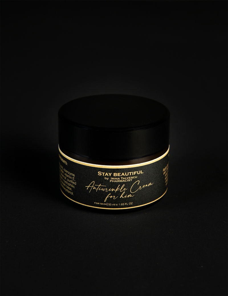 Stay beautiful- ANTIWRINKLE CREAM FOR HIM 50g - acid hialuronic, coenzima Q10, unt de shea, vitamina E, ulei de măceșe, ulei de măsline, apă purificată, glicerină, hydrophilic vanishing cream base, parfum