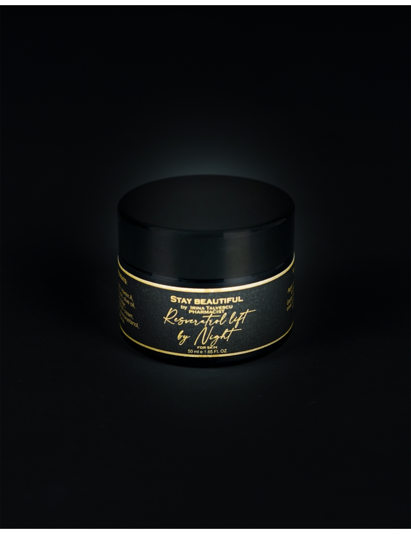 Ingrediente: Resveratrol, vitamina A, acid hialuronic, ulei de măsline, unt de shea, bază hidrofilă pentru cremă, etoxidiglicol, phenoxyetanol, parfum.