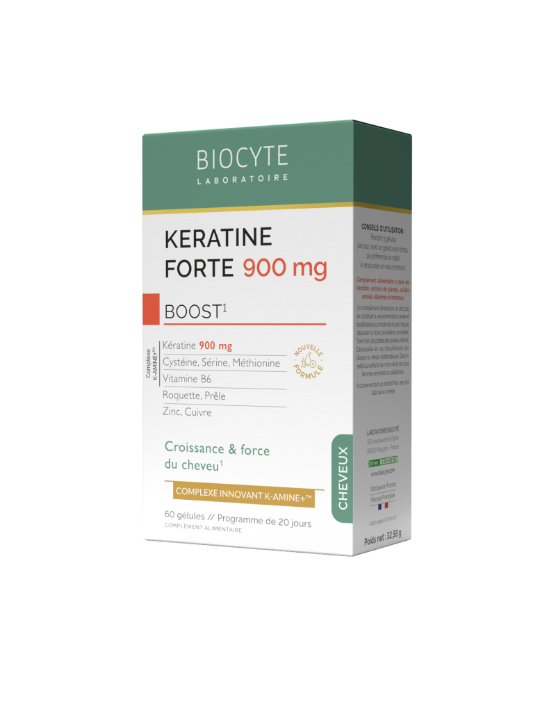 Biocyte a dezvoltat KERATINE FORTE 900 mg cu un complex K-AMINE+™ care oferă aminoacizi esențiali părului.