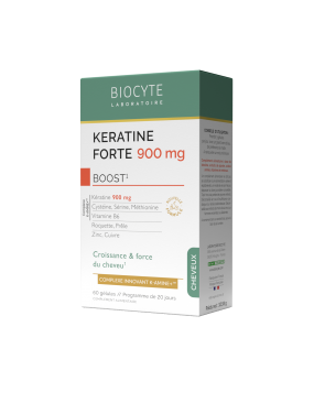 Keratine Forte 900 mg de la Biocyte conține keratină. Aceasta stimulează creșterea părului și îl întărește. Produsul este formulat cu complexul inovator K-AMINE+™, care combină keratină hidrolizată cu absorbție ridicată și aminoacizi esențiali precum cisteina, serina și metionina, esențiali pentru rezistența părului.